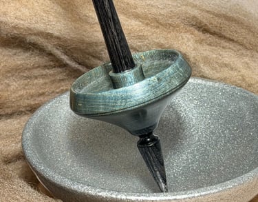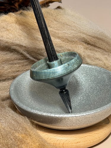 Because wood is a living, natural material, each piece carries its own unique character—including subtle variations in density. These gentle quirks in the wood can lead to a spindle that spins just slightly off balance when it is removed from the lathe. To bring harmony to the spin, I carefully add tiny copper counterbalance pins where they are needed. Initially I wanted to hide them, feeling they were a blemish or something to be ashamed of. I've come to terms with the fact working with natural materials is the cause, not because there is any deficiency in the spindle itself. This is just one more step in the process, another part of the story and how I deal with them is up to me. I decided to make them as pretty as possible and embrace them. You'll catch a glimpse of one—a delicate shimmer of copper tucked beneath the whorl. I like to think of them as beauty marks—a quiet sparkle that tells the story of the spindle’s journey to balance and grace.